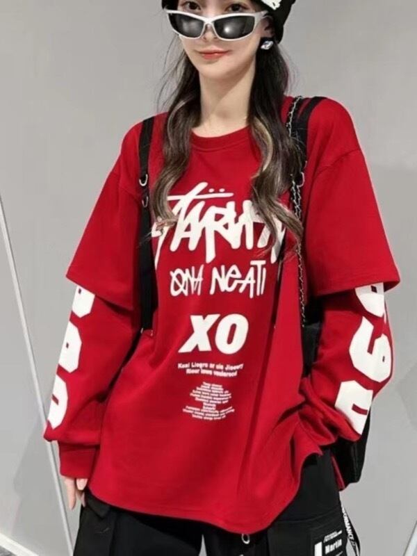 トップス Tシャツ 長袖 ロンT レイヤード プリント クルーネック ラウンドネック レディース