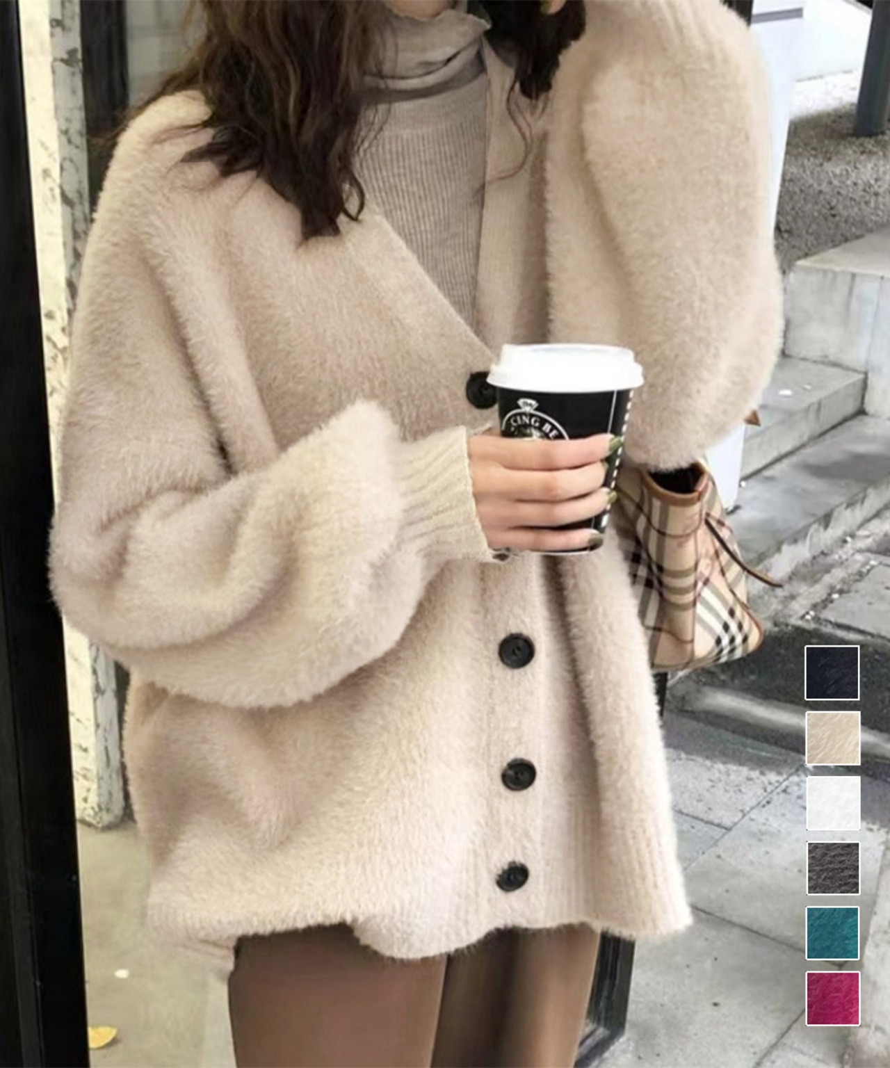 ルーズに羽織ってリラックス感のある着こなしを楽しめるシャギーニットカーディガン