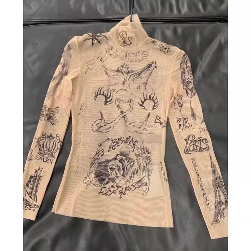 トップス カットソー ロンT Tシャツ 薄手 レース ハイネック プリント レディース